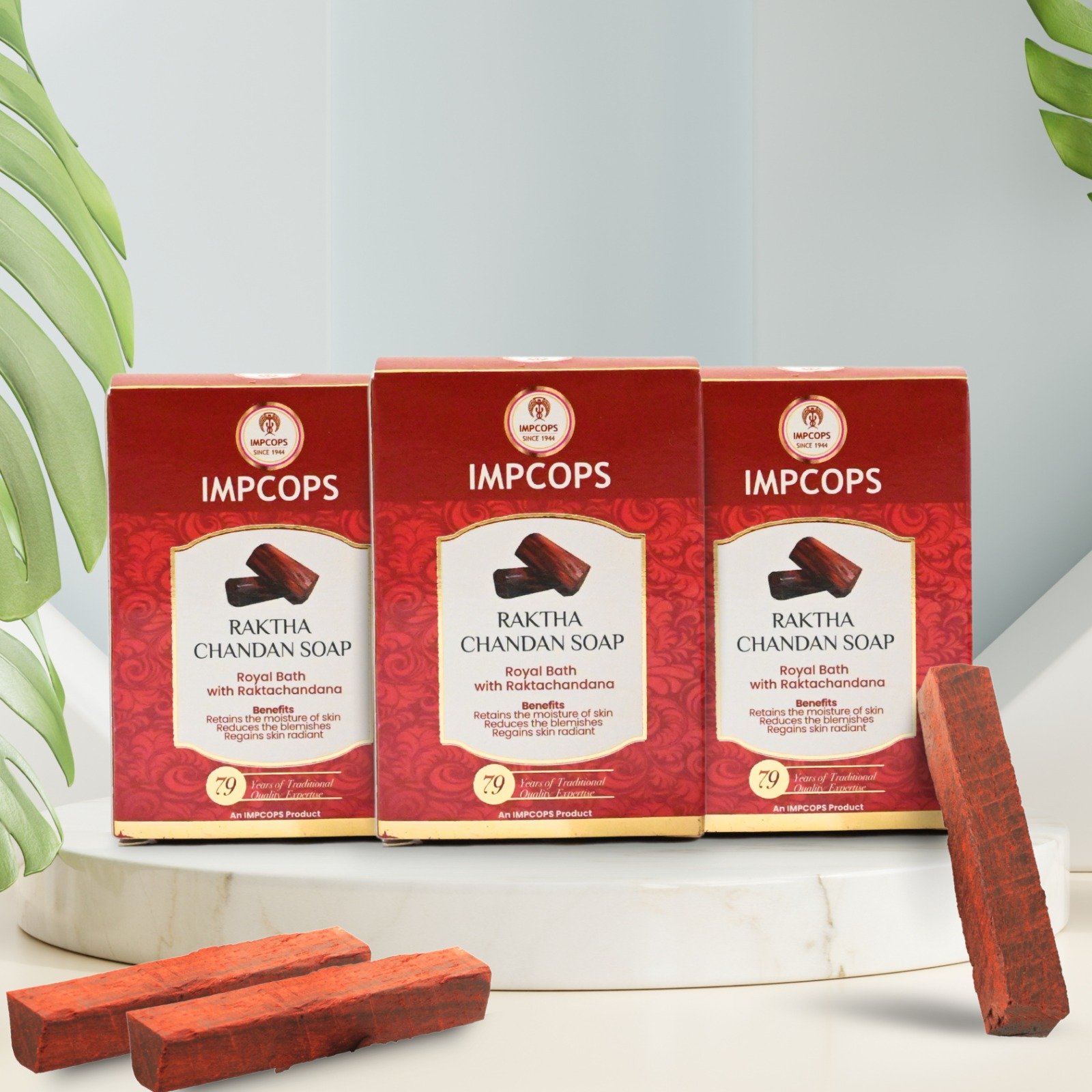 Experience the gentle yet powerful cleansing of IMPCOPS Raktha Chandan Soap in a convenient pack of three. Enriched with Red Sandalwood, this soap helps reduce blemishes, suntan, and acne while retaining skin moisture for a healthy, radiant glow. Ideal for daily use for naturally refreshed and nourished skin.